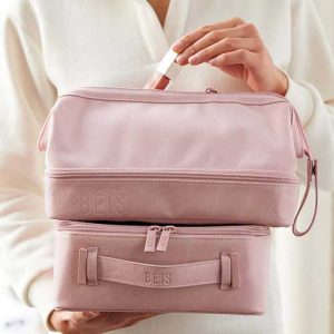 A spill-proof bag for all the bottles. tubes. jars and sprays your getting-ready routine requires. What we love most about this kit—besides its pair of organizational compartments—is the clever loop to hang from towel hooks so you can keep all your lotions and potions from falling off that tiny hotel vanity situation.