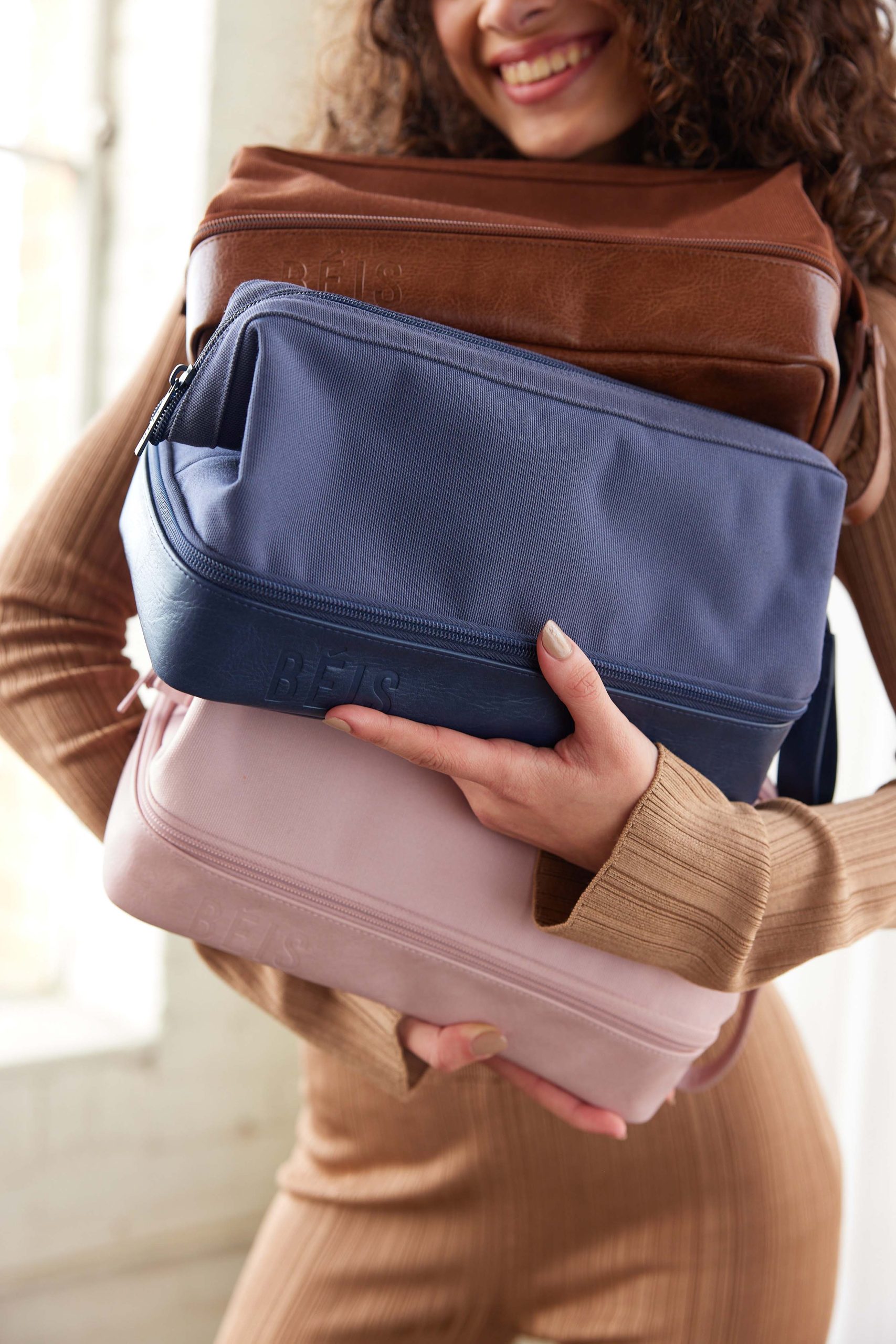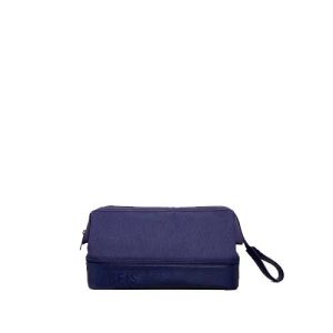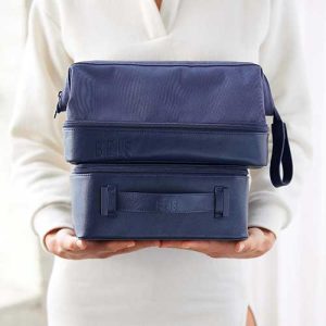 A spill-proof bag for all the bottles. tubes. jars and sprays your getting-ready routine requires. What we love most about this kit—besides its pair of organizational compartments—is the clever loop to hang from towel hooks so you can keep all your lotions and potions from falling off that tiny hotel vanity situation.