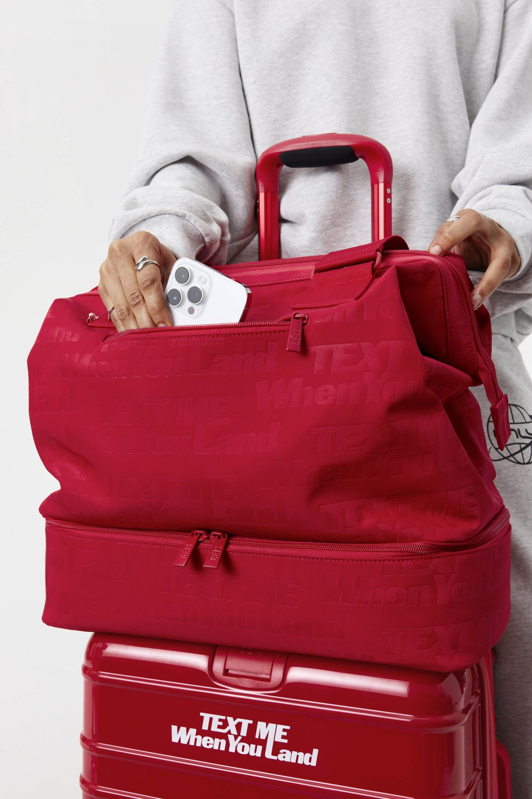 This limited-edition Mini Weekender features a TEXT ME WHEN YOU LAND debossed exterior + custom LONÉLY AIR lining on the interior. Feels like joining the Smile High Club for the first time 😉