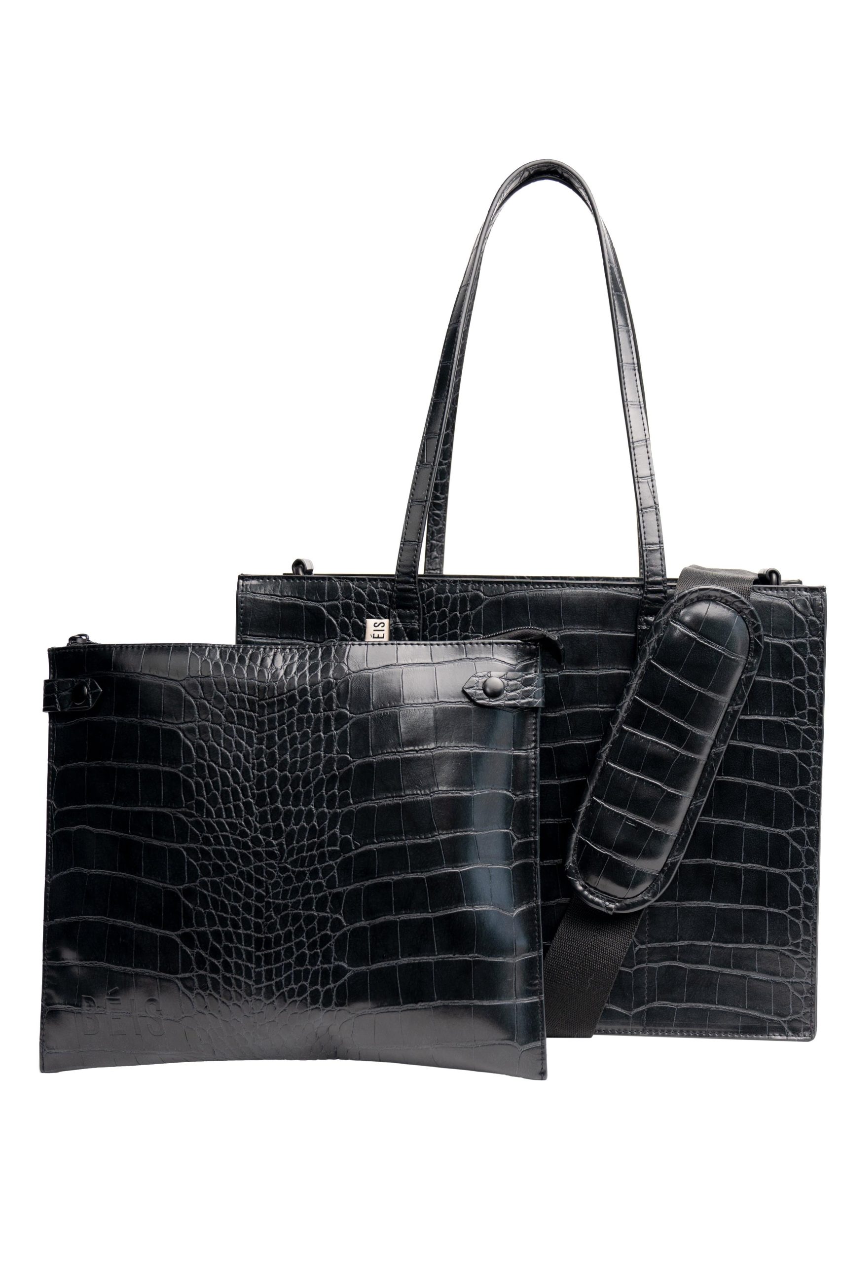 Meet the Work Tote in Black Croc! Take your work on the go with our versatile laptop tote bag. perfect for daily commutes or long trips away from the office. With multiple compartments and pockets. you’ll be able to fit everything you need for a productive day. Whether you’re working remotely or traveling for business. this work tote bag is the perfect accessory.