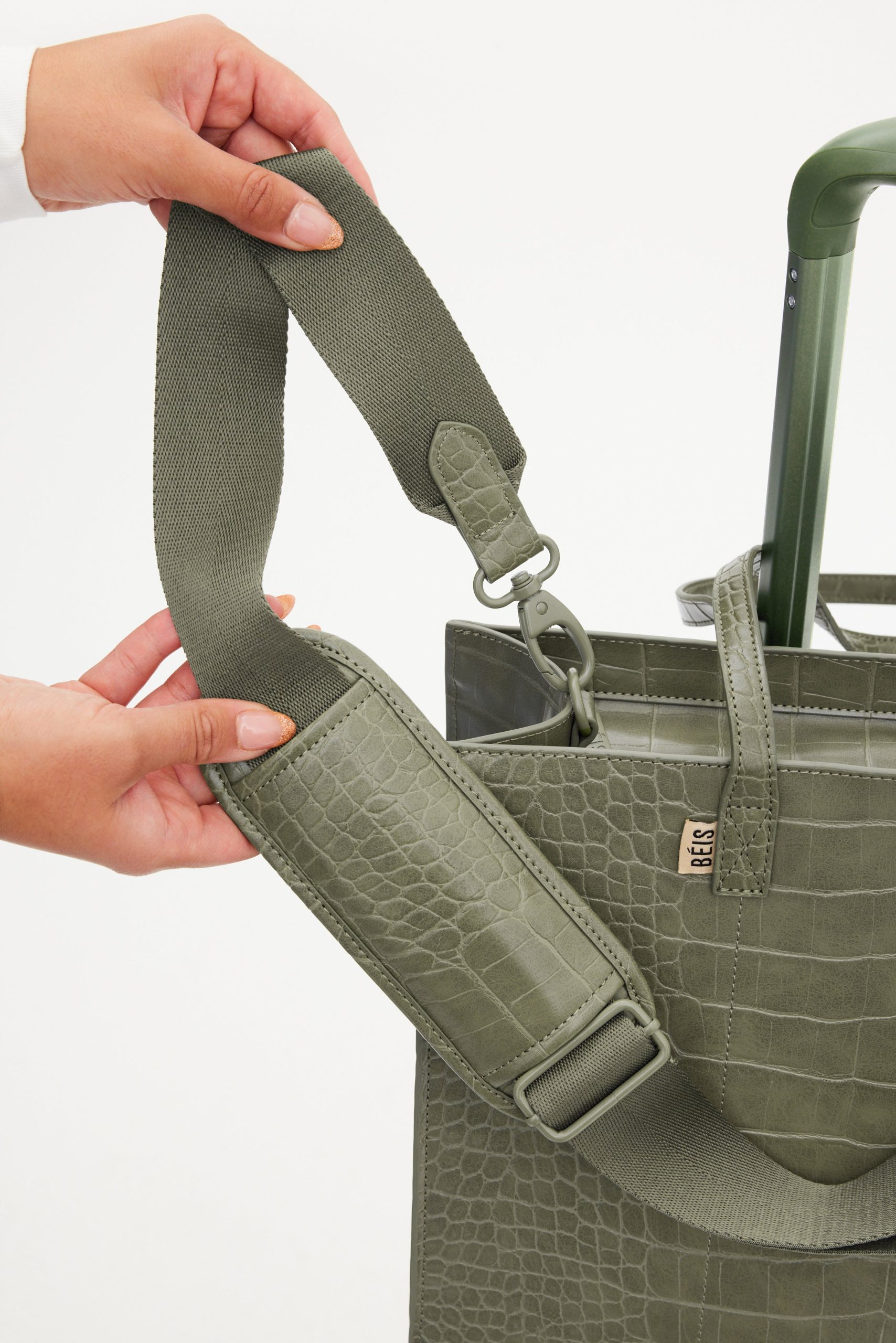 Meet the Work Tote in Olive Croc. Stay ahead of the curve with our innovative work tote bag. featuring cutting-edge design and functionality. With its magnetic closures and sturdier trolley pass-through. this bag is designed to keep up with your busy lifestyle. Whether you’re commuting to the office or traveling for business. this laptop tote bag is the perfect companion.