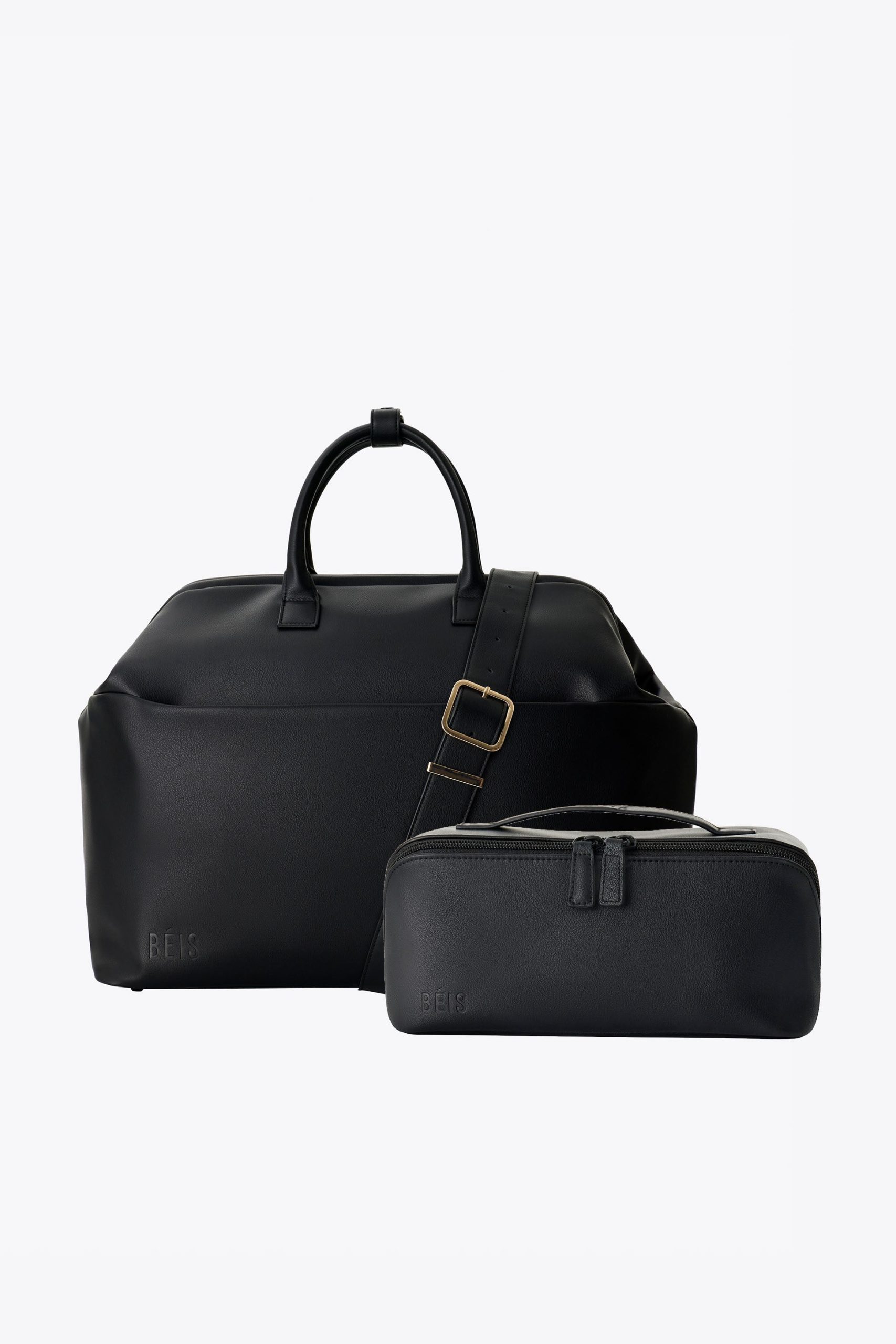 Perfectly packed for a stylish weekend escape. The Essential Weekend Travel Set pairs our Essential Weekender with the Essential Toiletry Kit—now bundled at 15% off. The Weekender. with luxe gold hardware. opens wide for effortless packing and features thoughtful interior organization. a trolley passthrough. and a detachable crossbody strap. The Toiletry Kit complements it beautifully—designed with a sophisticated vegan-leather exterior. wide‑opening access. wipeable lining. and compartments for brushes and bottles—so your grooming essentials stay polished and in place.