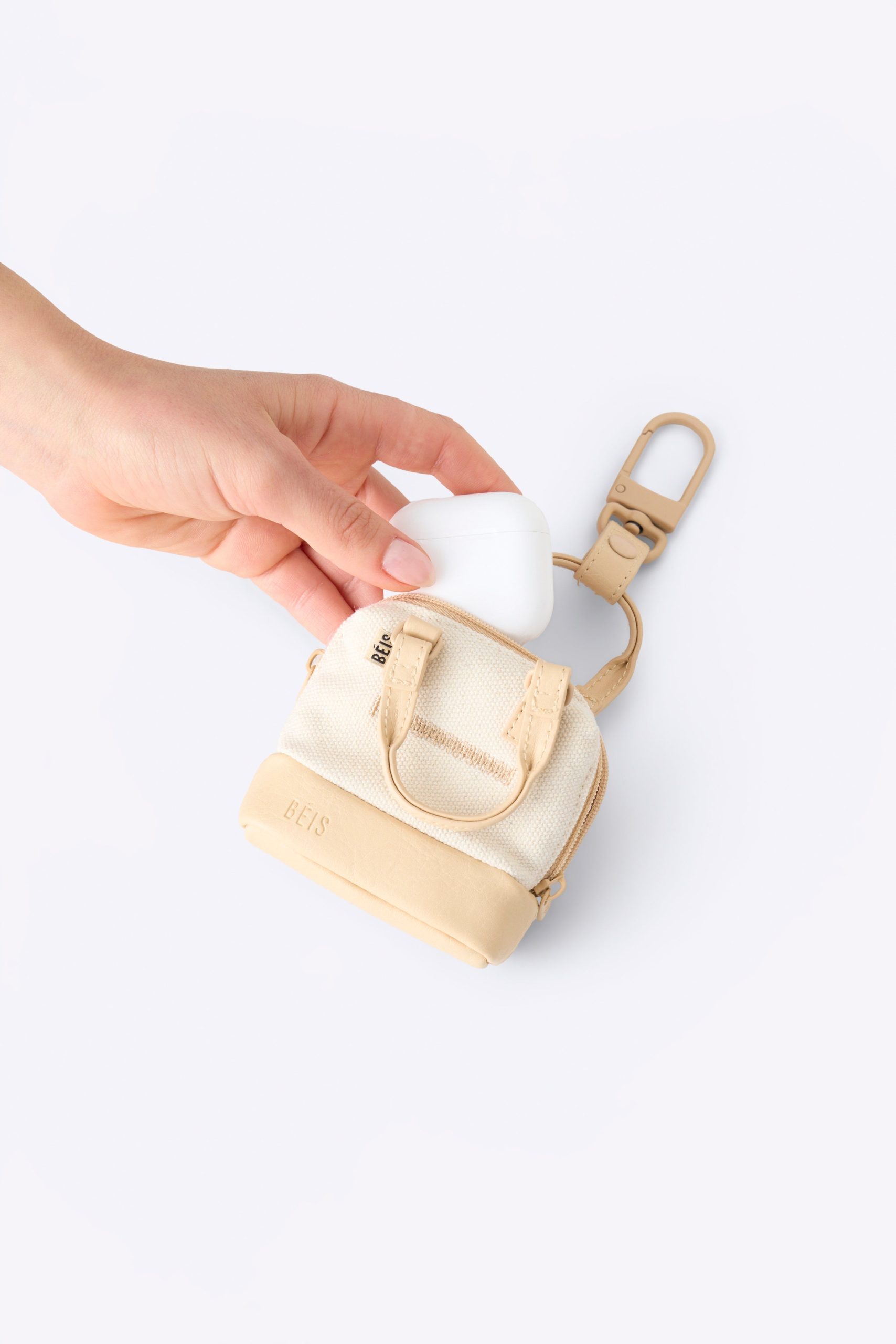 Add a pop of personality to your favorite bag with the Micro Weekender Charm in Maple. Featuring a pouch perfectly sized for stashing AirPods. chapstick—or other small items that tend to vanish—this downsized upgrade combines flair and function that work like a charm. Attach the keychain hook to any BÉIS bag with a D-ring (good news: that’s all of them) to instantly elevate your duffle. tote. or Weekender.